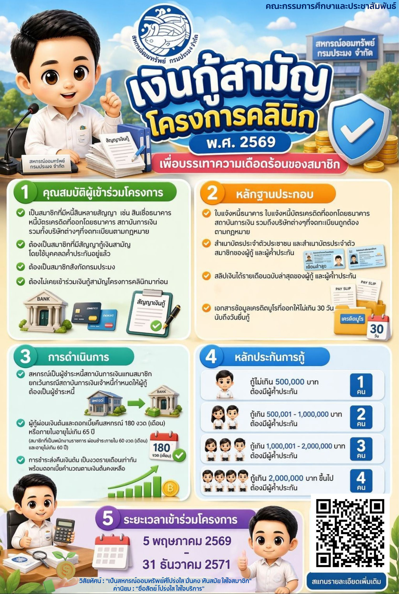 - สมาชิกส่งคืนเงินต้นและดอกเบี้ยแล้ว 6 เดือน จึงจะสามารถกู้ใหม่ได้